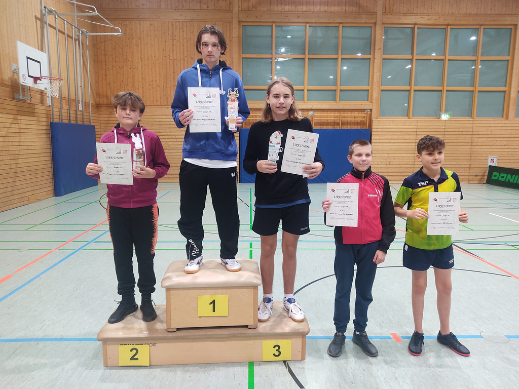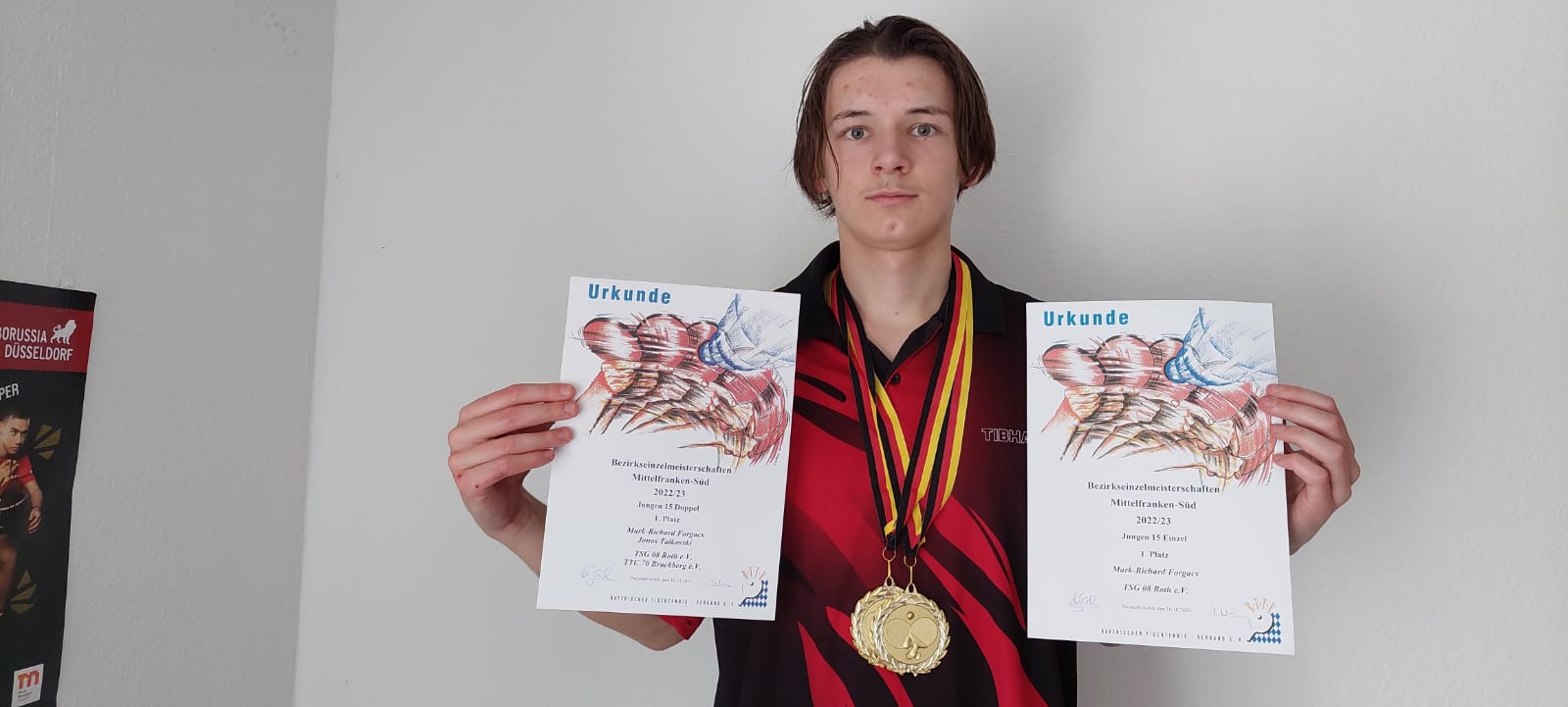 Seine stete Entwicklung nach oben bestätigte Mark Forgacs bei den TT-Bezirksmeisterschaften in Neustadt/Aisch. Er holte gleich zwei Titel in der Altersklasse Jungen 15. Im Doppel belegte er zusammen mit Jonas Talkovski vom TTC Bruckberg ohne Satzverlust den ersten Platz. Im Einzelwettbewerb beendete er die Vorrunde als Gruppenerster, ebenfalls ohne Satzverlust. Im anschließenden Ko-System traf er nach gewonnenem Viertelfinale im Halbfinale auf seinen Doppelpartner, den er 3:2 besiegte. Im Finale setzte er sich dann souverän mit 3:0 gegen Johannes Christl vom 1. FC Heilsbronn durch. Mark ist damit – wie seine Schwester Hanna – bereits für die Bayerischen Einzelmeisterschaften qualifiziert.
