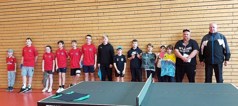 Auch in diesem Jahr war wieder Manfred Hanisch aus Penzendorf mit seiner TT-AG zu einem Freundschaftsturnier bei uns zu Gast. Insgesamt nahmen 8 Spieler aus Schwabach und 5 Jugendliche unserer Jugend2 und Jugend 3 an dem Turnier teil. Zunächst wurde in zwei gemischten Gruppen im Modus Jeder gegen Jeden gespielt. Anschließend traten die Platzierten der einen Gruppe gegen die entsprechenden der anderen an. Jugendtrainer Robert Stotko und der Betreuer der Jugend3, Jens Slabolepszy, sorgten für den reibungslosen Verlauf des Turniers. Am Ende konnte jeder Teilnehmer noch einen kleinen Sachpreis mit nach Hause nehmen.